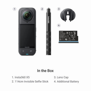 Starter Bundle includes 1x Insta360 X5, 1x Lens Cap, 1x Additional Battery and 1x 114cm Invisible Selfie Stick.